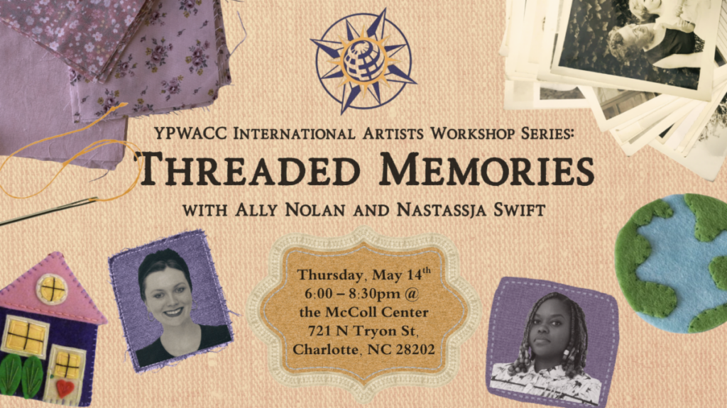 Join YPWACC for an exclusive, small-group experience at the McColl Center on May 14th from 6:00–8:30 p.m. Threaded Memories is a hands-on textile workshop where personal stories and artistic expression come together in a powerful, creative setting.
