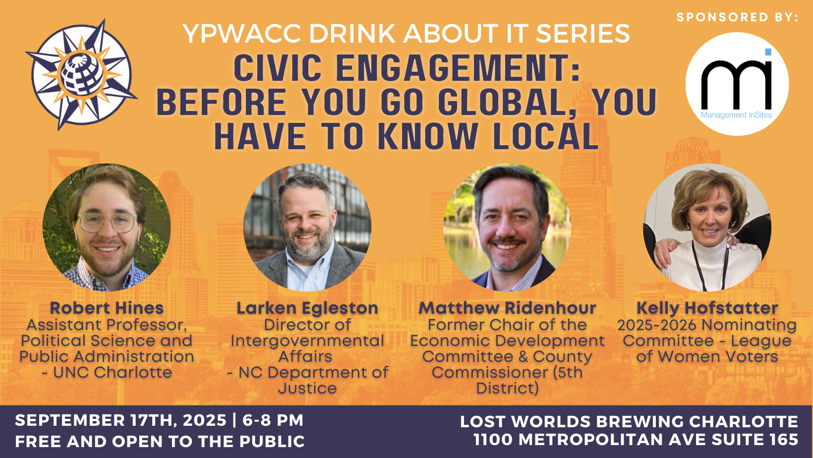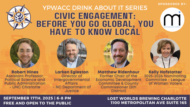 This session, “Civic Engagement: Before You Go Global, You Have to Know Local,” will be a moderated conversation between our panel of experts. Join us for a dynamic conversation focused on increasing awareness and understanding of our local governance here in Charlotte-Mecklenburg County. We will provide participants with a foundational overview of how local government functions across Charlotte and equip you with the knowledge needed to become informed, engaged members of your community.
